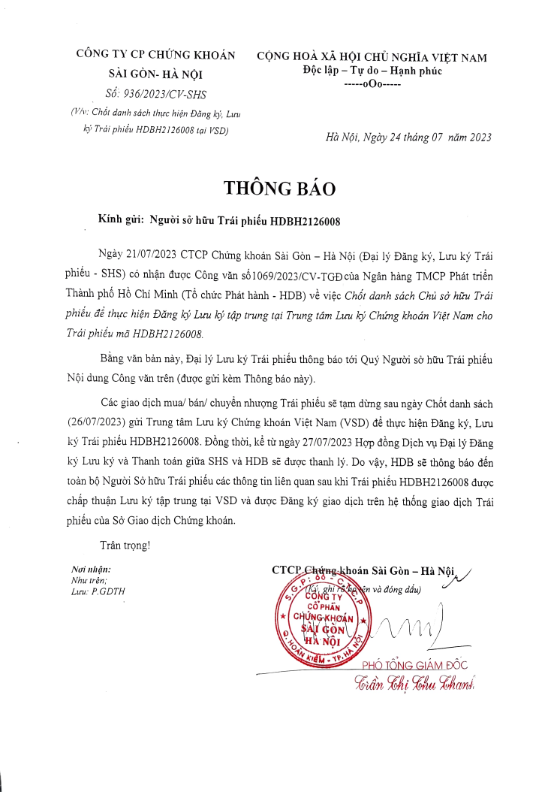 - - Thông báo về việc Chốt danh sách Người Sở hữu Trái phiếu HDBH2227007 để thực hiện Đăng ký, lưu ký tại VSD - 24/07/2023