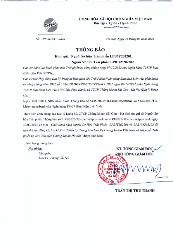 - Thông báo: Về việc Ngân hàng TMCP Bưu Điện Liên Việt sẽ đại diện cho Người Sở Hữu Trái Phiếu LPB7Y202201 và LPB10Y202202 để thực hiện ký gửi và lưu ký Trái phiếu tập trung tại Trung tâm Lưu ký Chứng khoán Việt Nam (VSD) - 03/04/2023