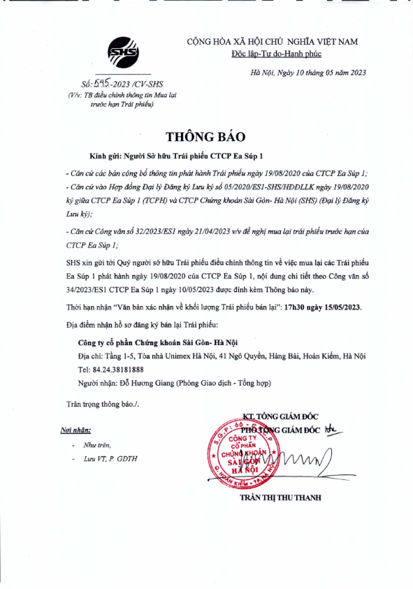 - Thông báo v/v lấy ý kiến Người sở hữu Trái phiếu CTCP Ea Súp 1 - 10/05/2023