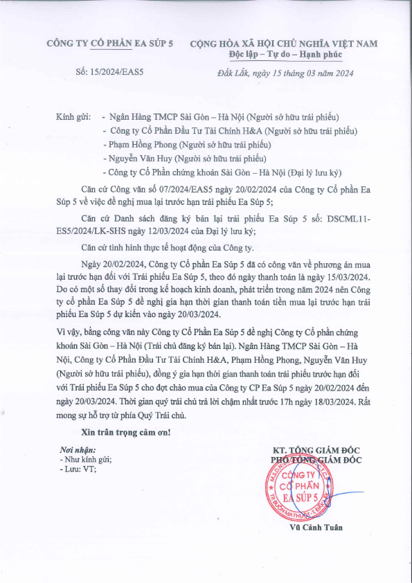 Thông báo về việc gia hạn thời gian thanh toán tiền mua lại trước hạn trái phiếu Công ty cổ phần EA súp 5