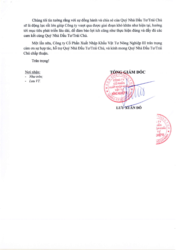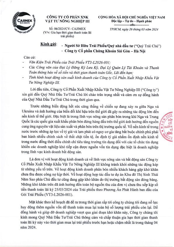 Thông báo về việc gia hạn thời gian thanh toán trả lãi trái phiếu CTCP Xuất nhập khẩu Vật tư Nông nghiệp III