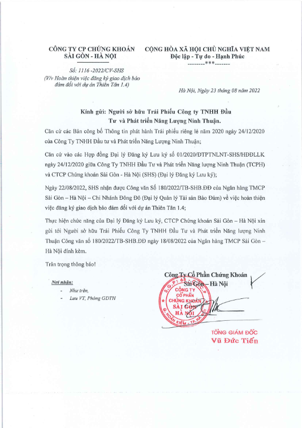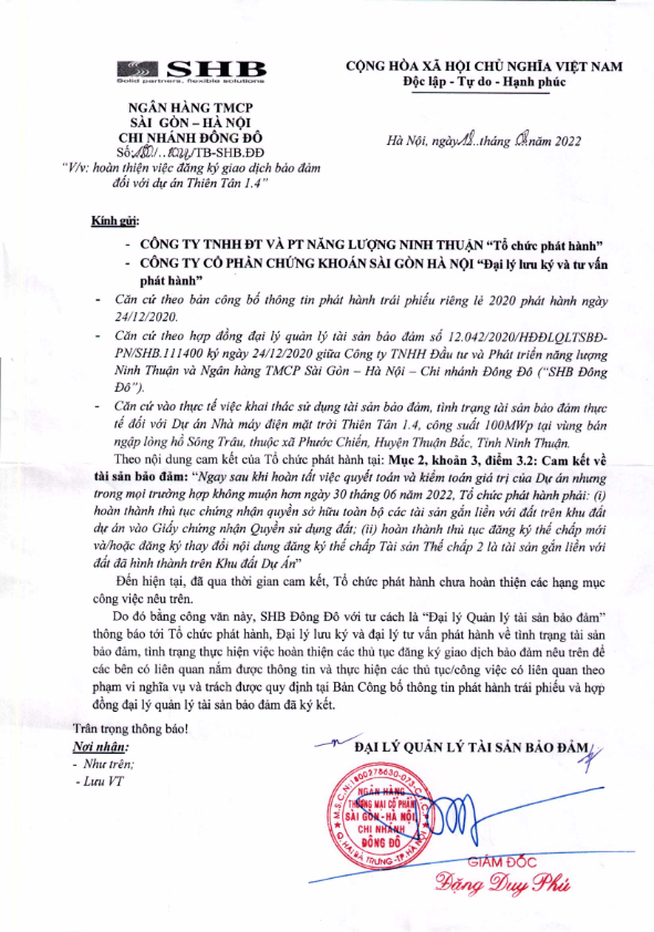 Thông báo về việc Hoàn thiện việc đăng ký giao dịch bảo đảm đối với dự án Thiên Tân 1.4 Công ty TNHH Đầu Tư và Phát triển Năng Lượng Ninh Thuận