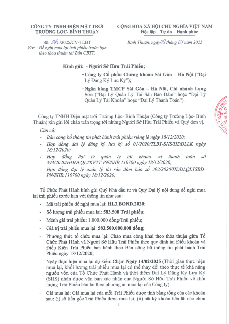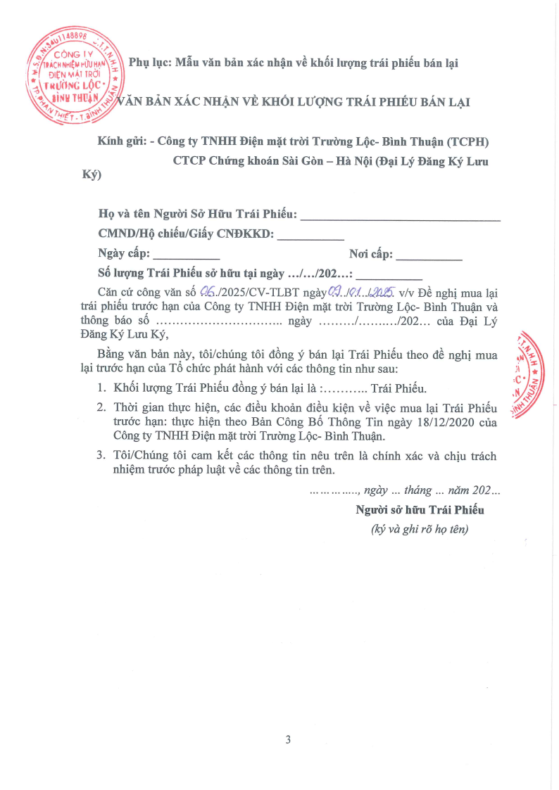 Thông báo về việc Lấy ý kiến Người sở hữu Trái Phiếu Công ty TNHH Điện mặt trời Trường Lộc – Bình Thuận