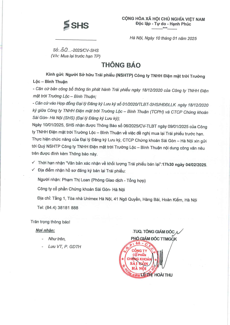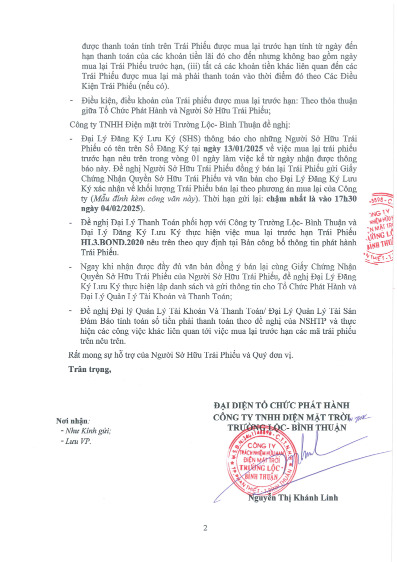 - Thông báo về việc Mua lại trước hạn TP CTCP Công nghiệp Năng lượng Ninh Thuận - 10/01/2025