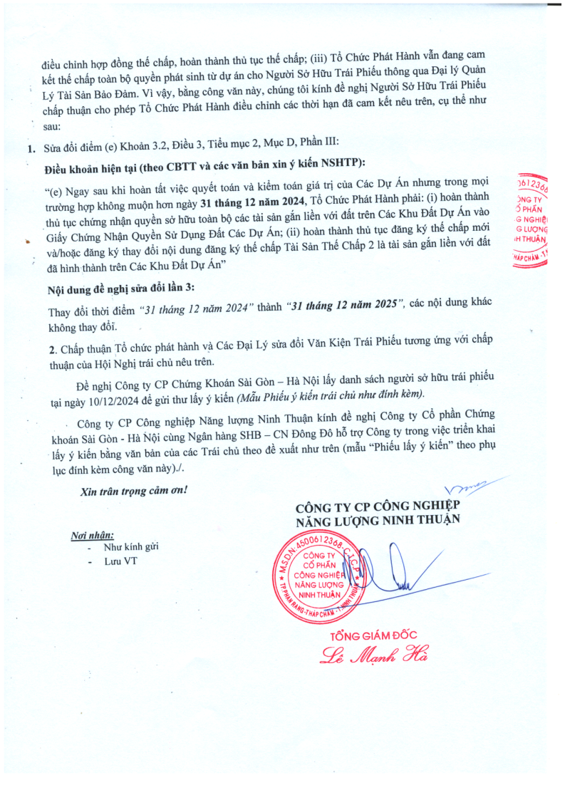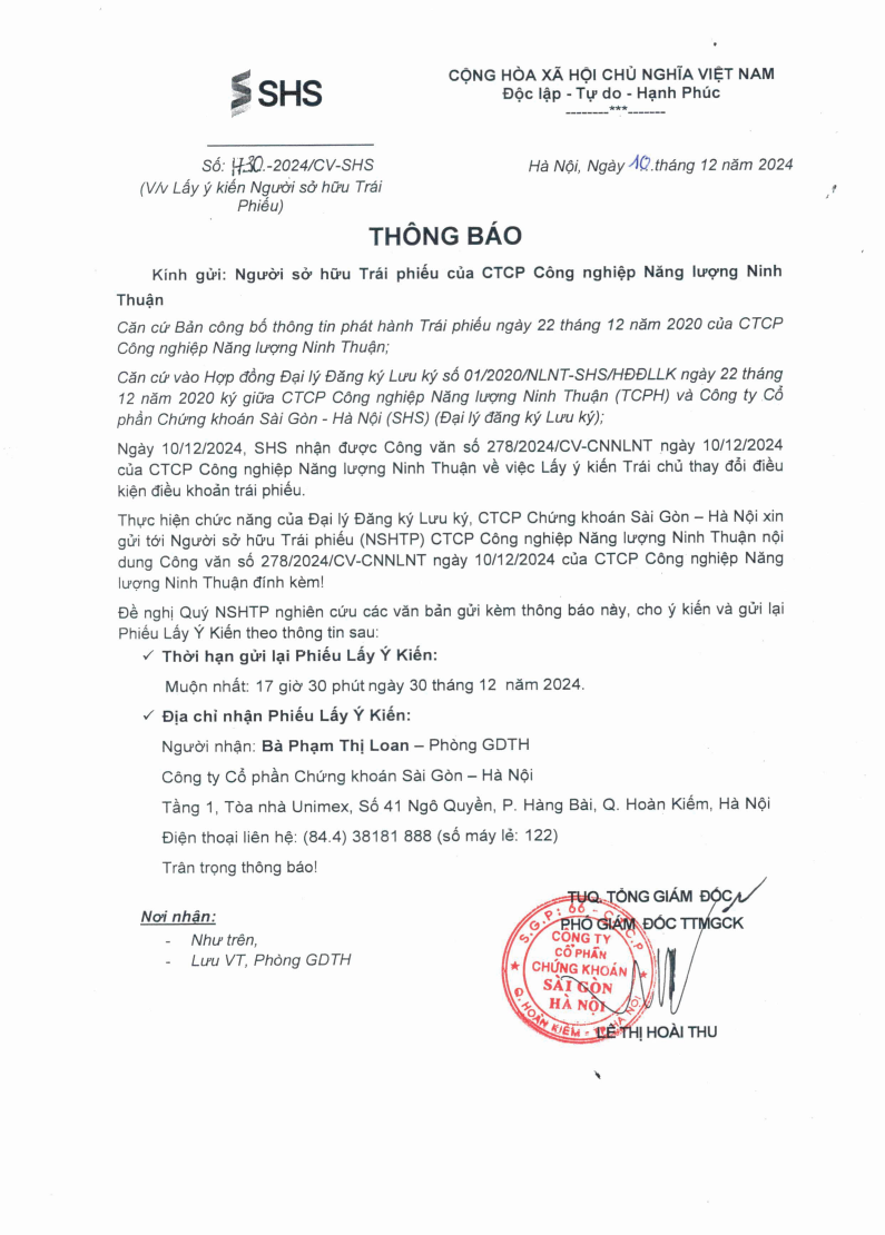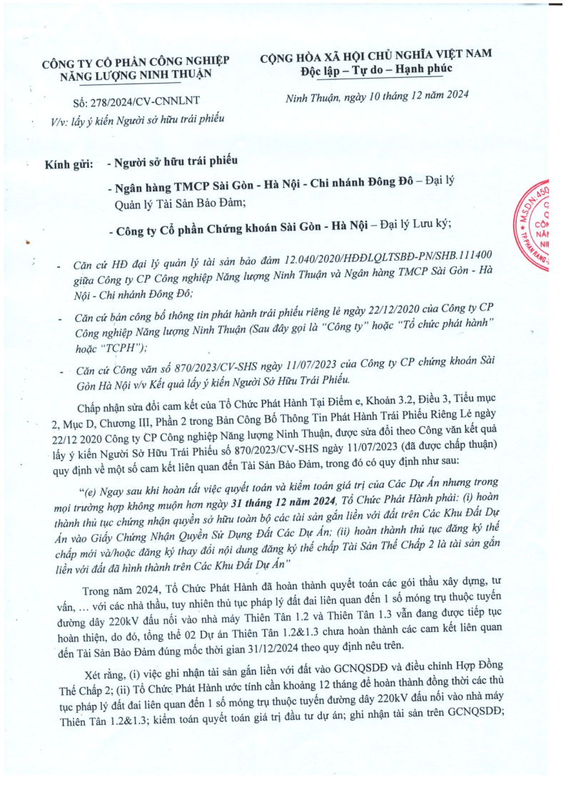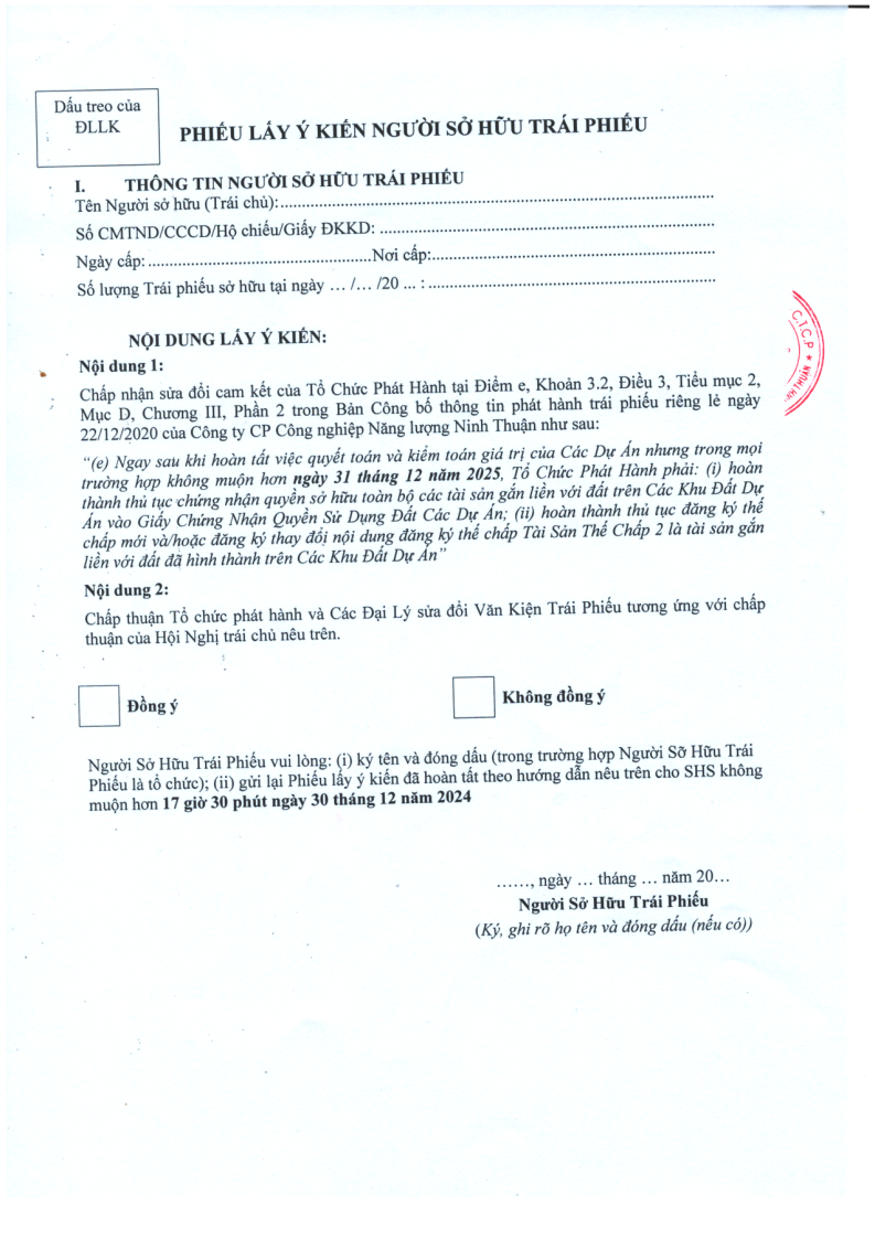 - Thông báo về việc Lấy ý kiến NSHTP Công ty Cổ phần Công nghiệp Năng lượng Ninh Thuận