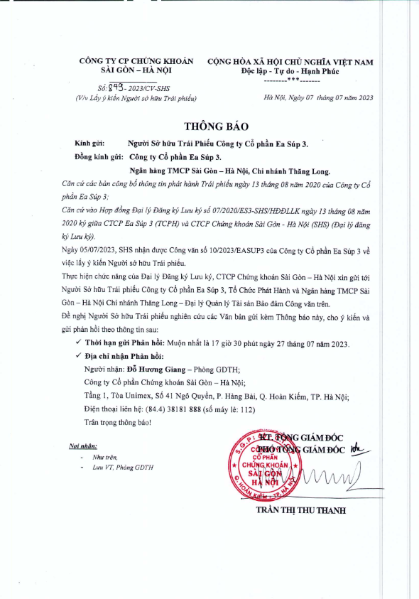 Thông báo về việc lấy ý kiến NSHTP Trái phiếu ES3