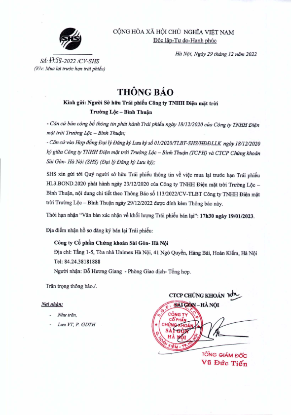 - Thông báo về việc mua lại trái phiếu trước hạn Trái phiếu CTCP Xuân Thiện Thuận Bắc - 21/12/2022