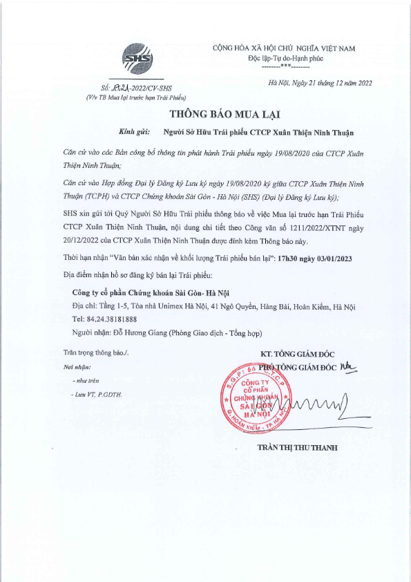 - Thông báo về việc mua lại trái phiếu trước hạn Trái phiếu CTCP Xuân Thiện Thuận Bắc - 21/12/2022