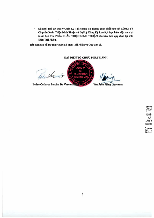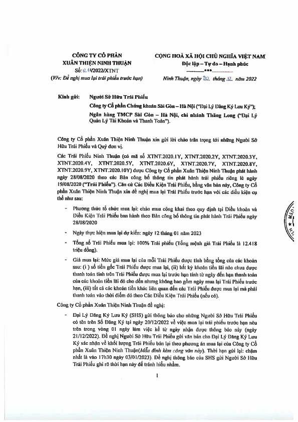 Thông báo về việc mua lại trái phiếu trước hạn Trái phiếu CTCP Xuân Thiện Ninh Thuận
