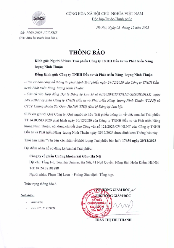 Thông báo về việc mua lại trái phiếu trước hạn TT.14.BOND.2020