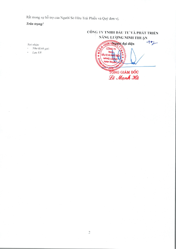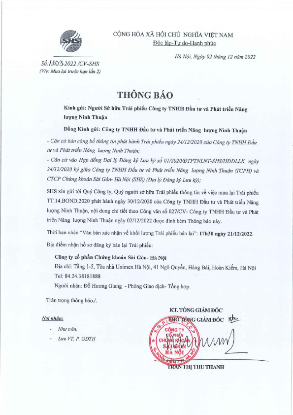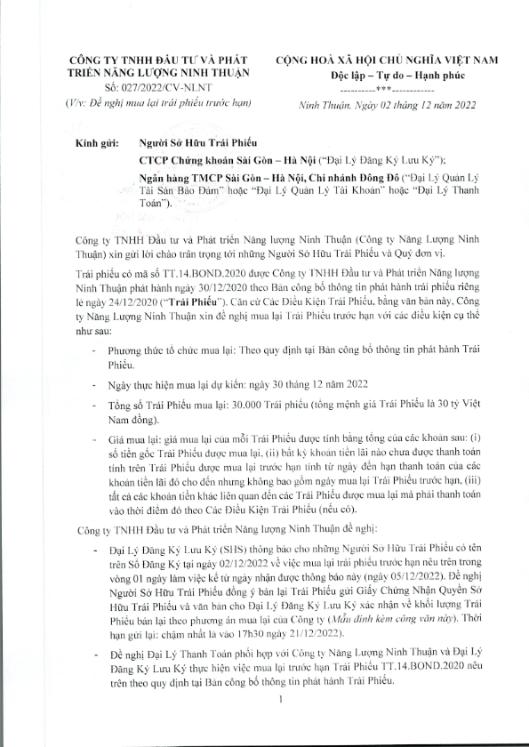 Thông báo về việc mua lại trái phiếu trước hạn TT.14.BOND.2020 Công ty TNHH Đầu tư và phát triển Năng lượng Ninh Thuận
