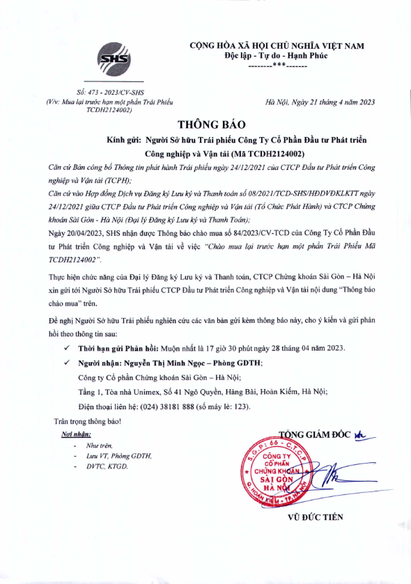 - Thông báo về việc Lấy ý kiến Người sở hữu Trái Phiếu TCDH2124002 Công ty Cổ phần Đầu tư Phát triển Công nghiệp và Vận tải - 12/04/2023