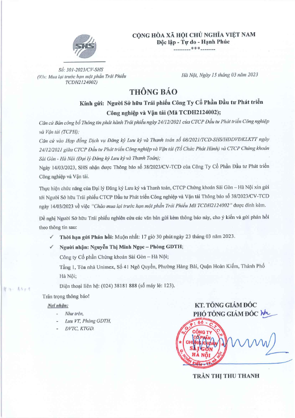 Thông báo về việc Mua lại trước hạn một phần Trái Phiếu TCDH2124002 Công ty Cổ phần Đầu tư Phát triển Công nghiệp và Vận tải
