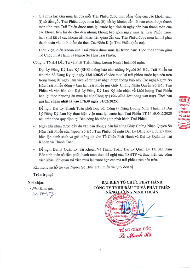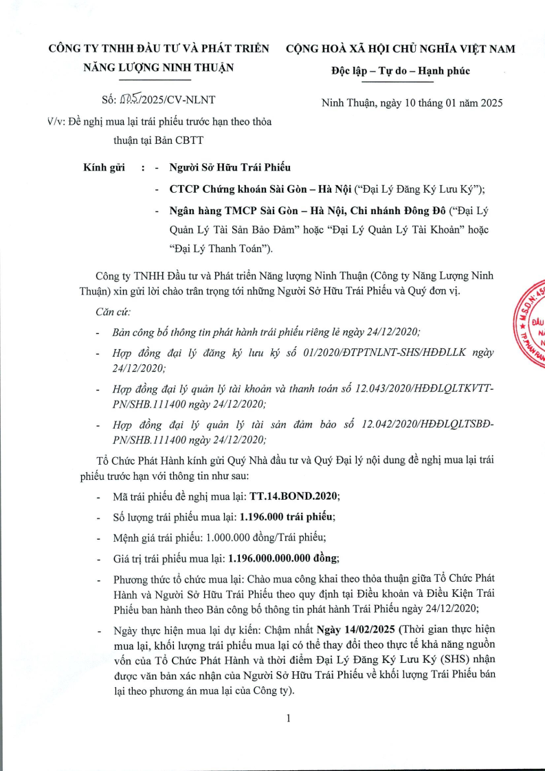 - Thông báo về việc Mua lại trước hạn TP CTCP Công nghiệp Năng lượng Ninh Thuận - 10/01/2025