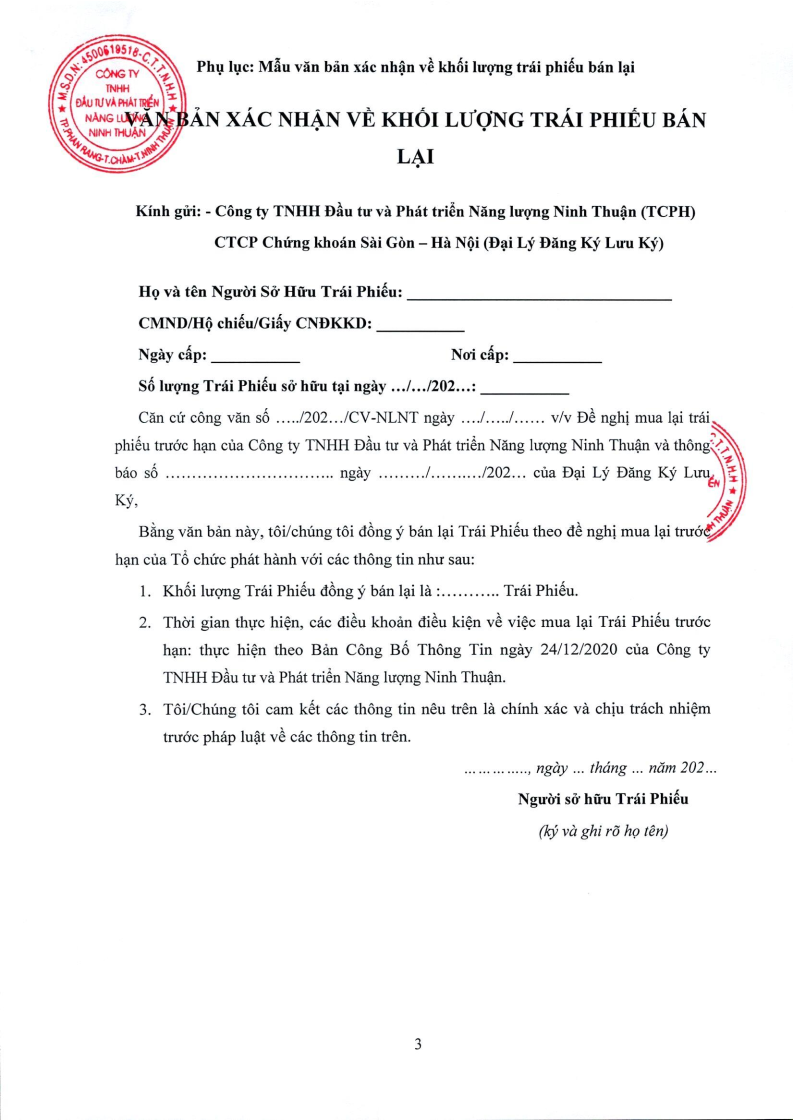Thông báo về việc Mua lại trước hạn TP Công ty TNHH Đầu tư và Phát triển Năng lượng Ninh Thuận