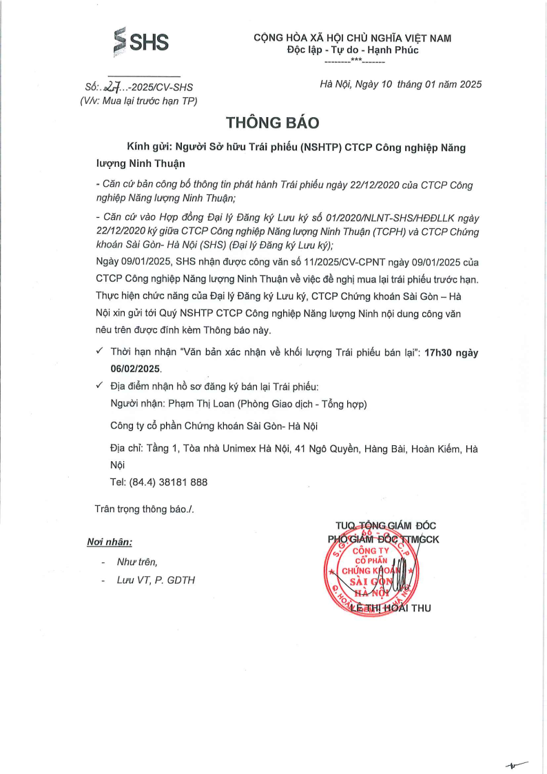 Thông báo về việc Mua lại trước hạn TP CTCP Công nghiệp Năng lượng Ninh Thuận