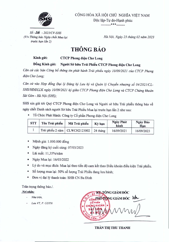 - Thông báo Về việc Ngày chốt Trả lãi kỳ 3 Trái Công ty Cổ phần Phong điện Chơ Long - 23/02/2023