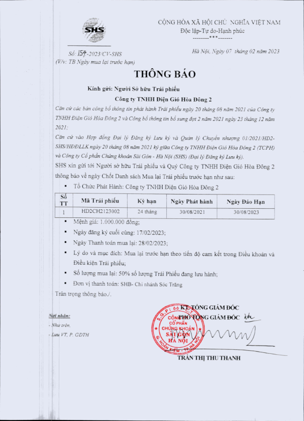 Thông báo Về việc Mua lại trước hạn Trái Phiếu Công ty TNHH Điện Gió Hòa Đông 2 mã HD2CH2123002