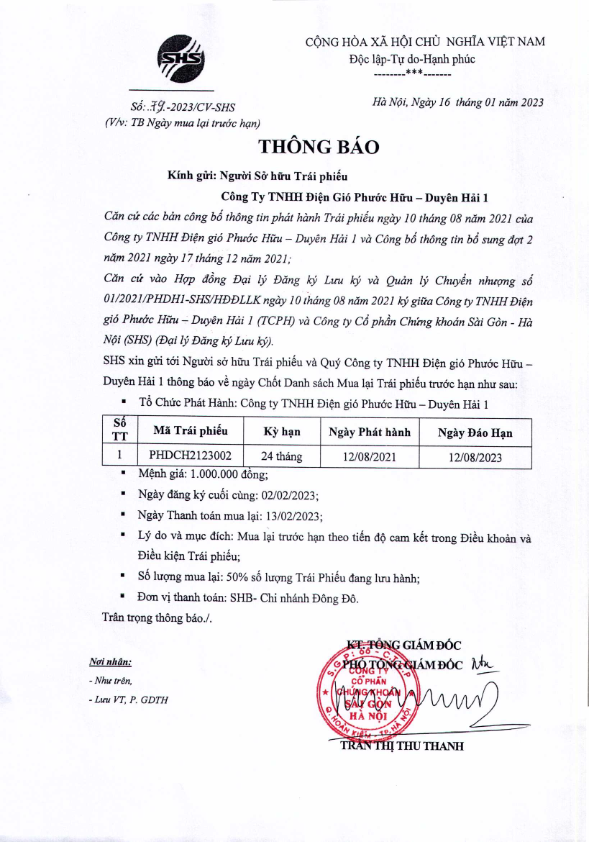 Thông báo Về việc Mua lại trước hạn Trái Phiếu Công ty TNHH Điện gió Phước Hữu – Duyên Hải 1 mã PHDCH2123002