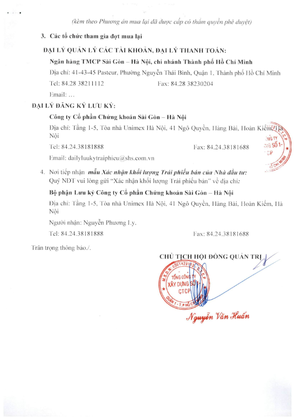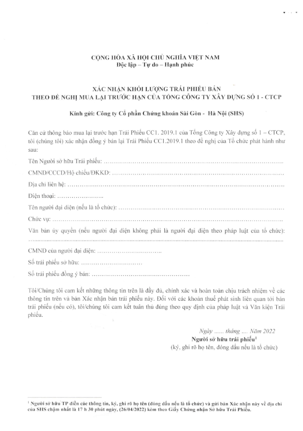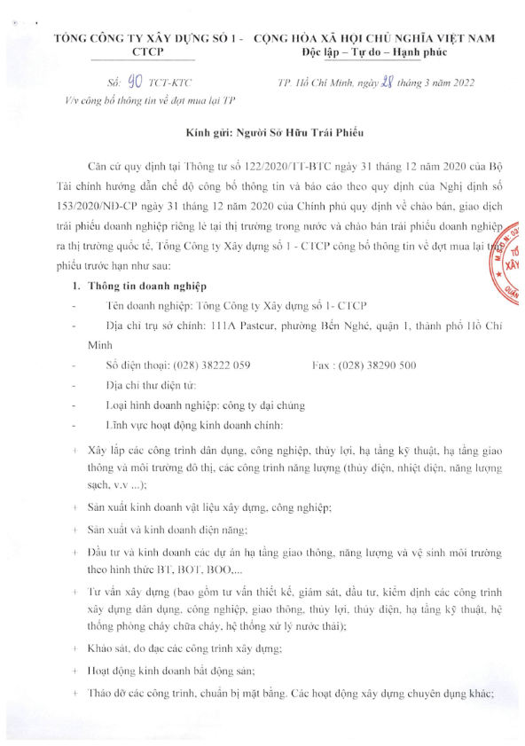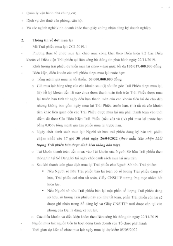 Thông báo Về việc mua lại trước hạn Trái phiếu TP.CC1.2019.1 của Tổng công ty xây dựng số 1- CTCP