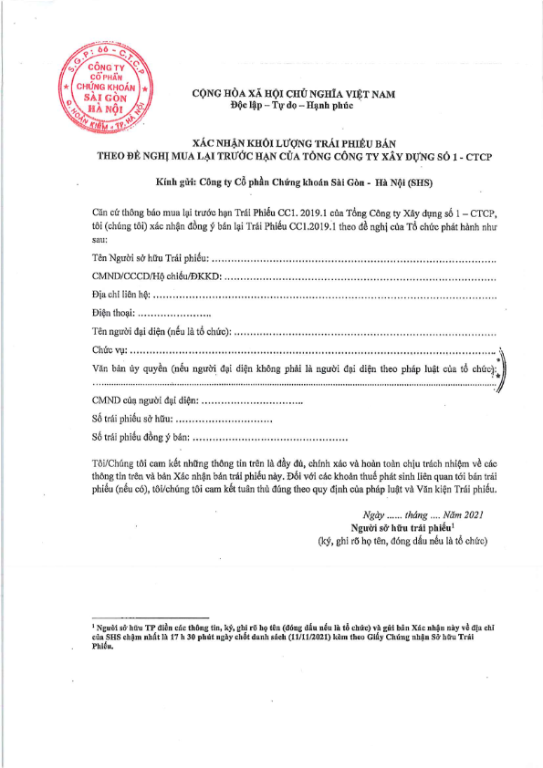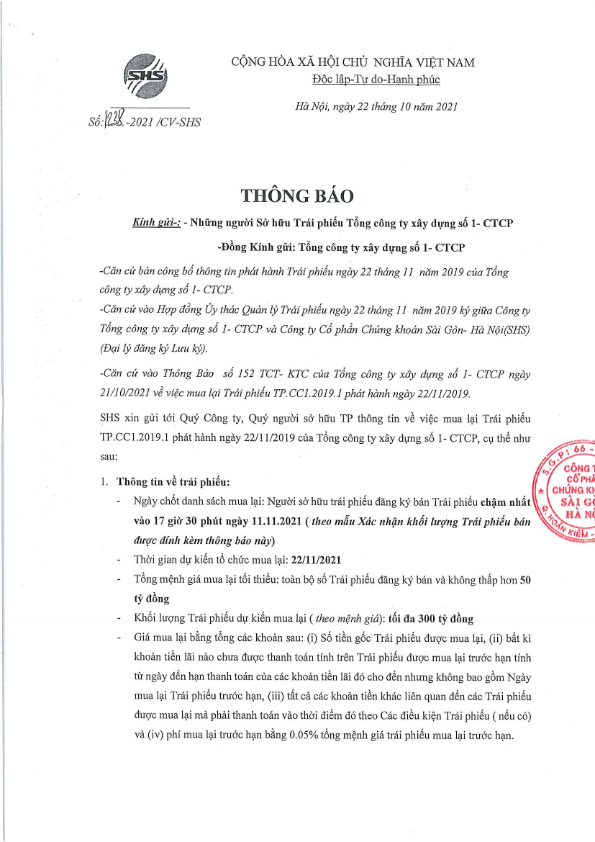 Thông báo Về việc mua lại trước hạn Trái phiếu TP.CC1.2019.1 của Tổng công ty xây dựng số 1- CTCP