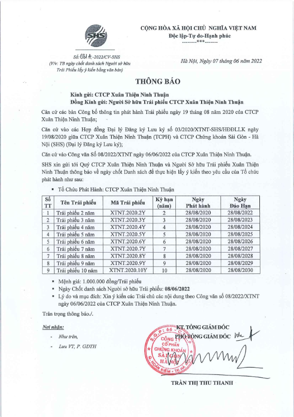 Thông báo về việc ngày chốt lấy ý kiến NSHTP CTCP Xuân Thiện Ninh Thuận