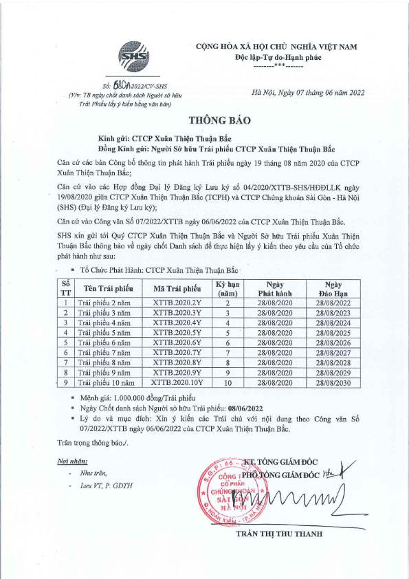 Thông báo về việc ngày chốt lấy ý kiến NSHTP CTCP Xuân Thiện Thuận Bắc