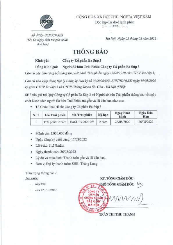 - Thông báo về việc ngày chốt trả lãi Trái phiếu ES3 CTCP Ea Súp 3 - 05/08/2022