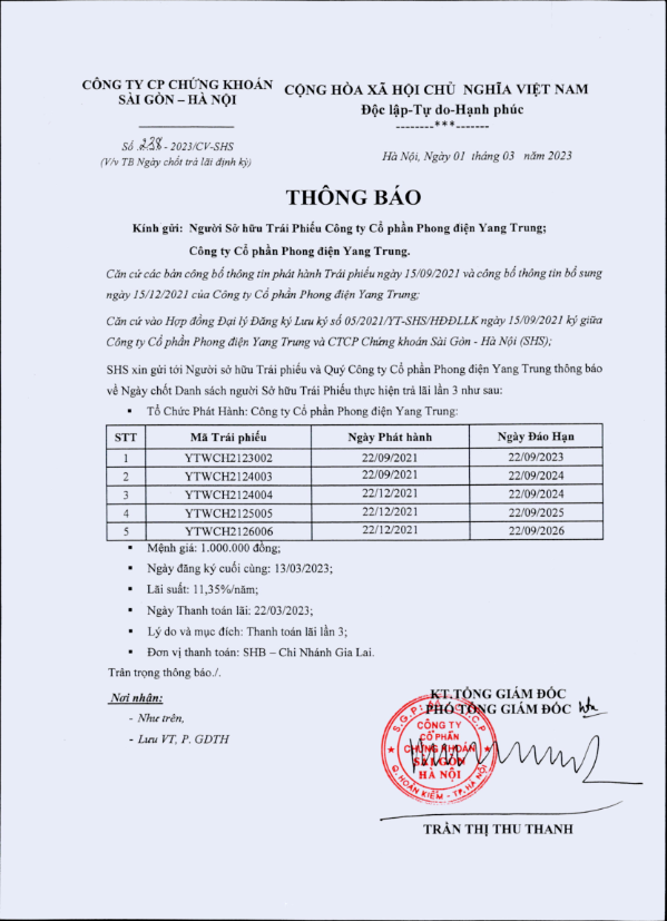 Thông báo Về việc Ngày chốt Trả lãi kỳ 3 Trái Phiếu Công ty Cổ phần Phong điện Yang Trung