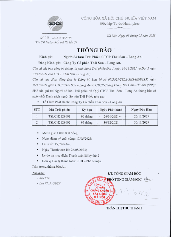 Thông báo Về việc Ngày Chốt trả lãi TP Công ty Cổ phần Thái Sơn – Long An