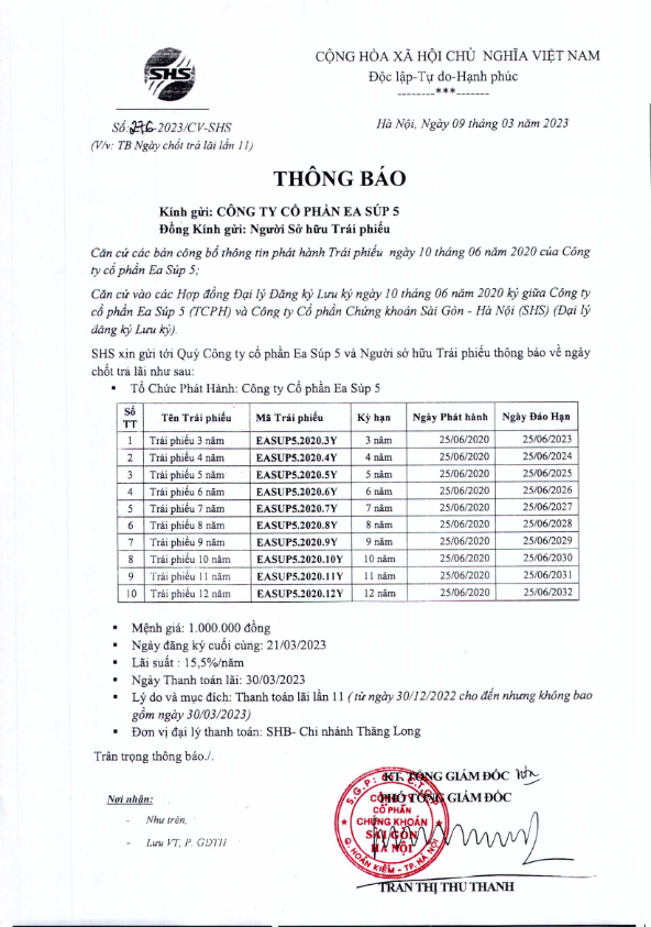 Thông báo về việc ngày chốt trả lãi TP Ea Súp 5