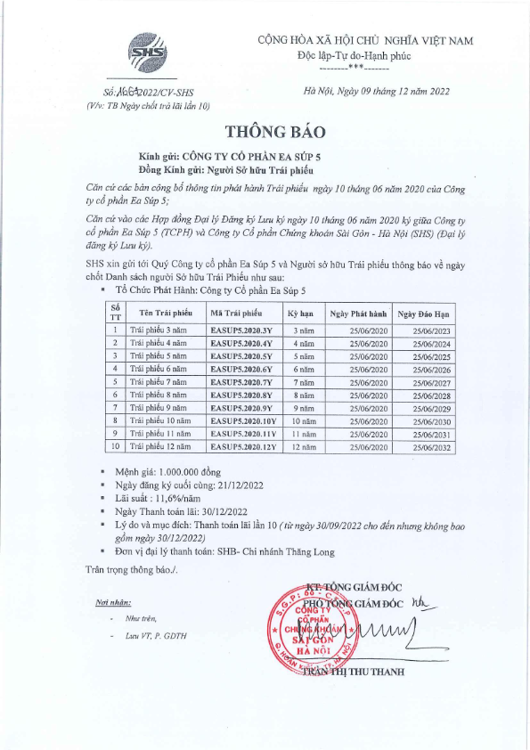 Thông báo về việc ngày chốt trả lãi TP Ea Súp 5
