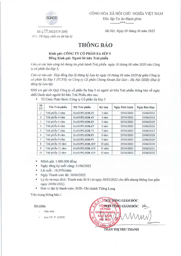 Thông báo về việc ngày chốt trả lãi TP Ea Súp 5