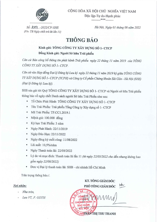 Thông báo về việc ngày chốt trả lãi Trái phiếu CC1 Tổng công ty Xây dựng số 1 - CTCP