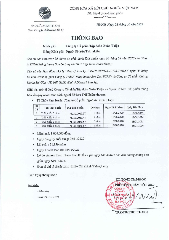 Thông báo về việc ngày chốt trả lãi Trái phiếu CTCP Tập đoàn Xuân Thiện (NLSL)