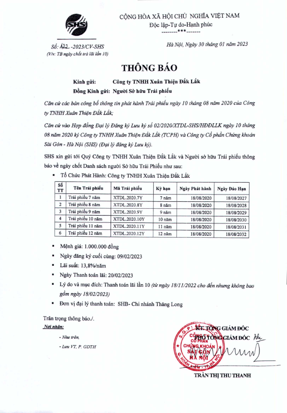 Thông báo về việc ngày chốt trả lãi Trái phiếu XTDL Công ty TNHH Xuân Thiện Đắk Lắk
