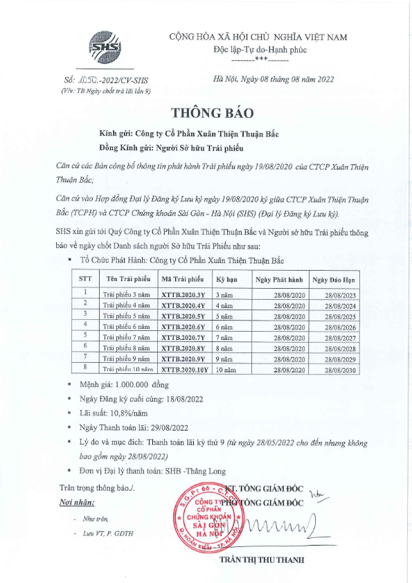 - Thông báo về việc ngày chốt trả gốc và lãi Trái Phiếu XTNT.2Y - 08/08/2022