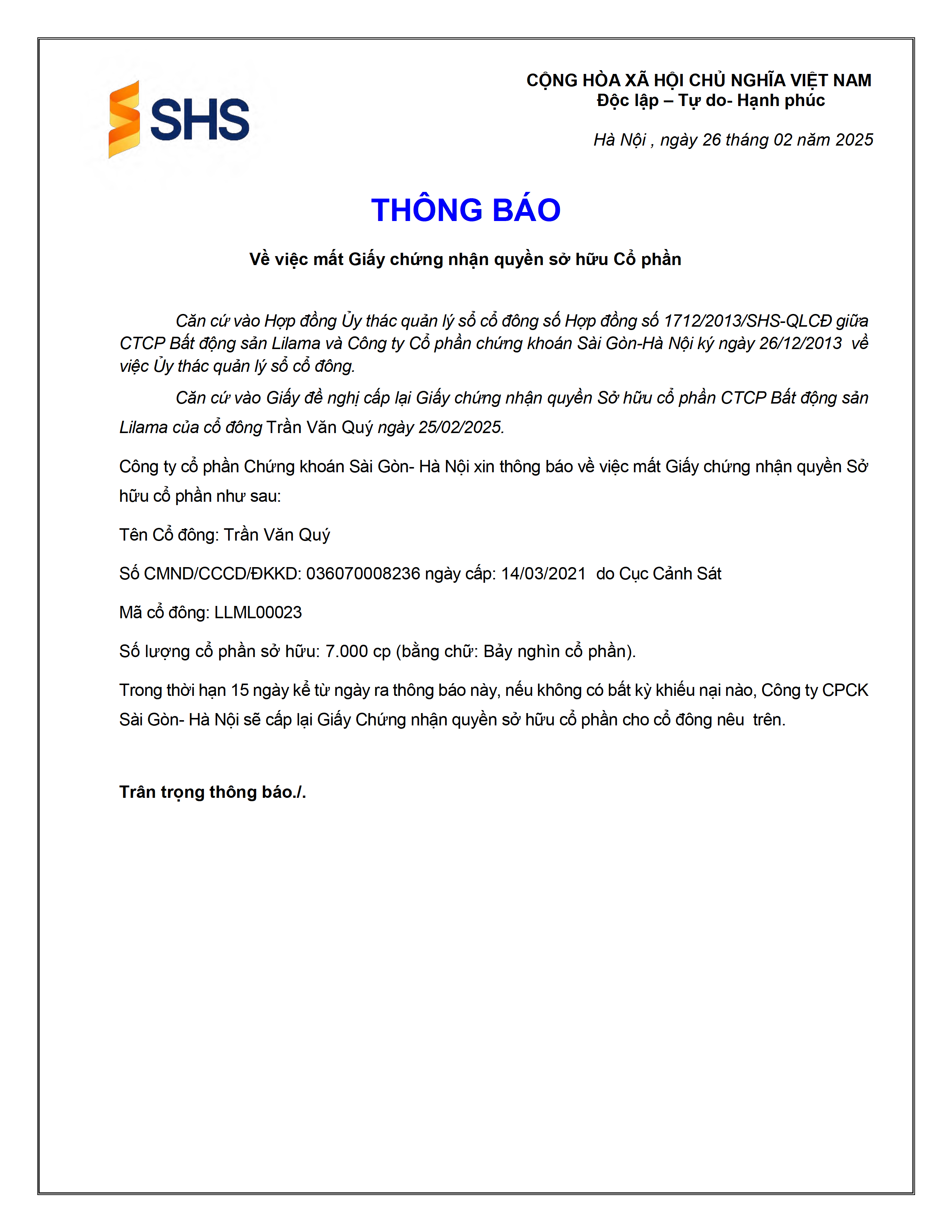 Thông báo Về việc thất lạc Giấy chứng nhận quyền sở hữu cổ phần Công ty CP bất động sản Lilama của Trần Văn Quý