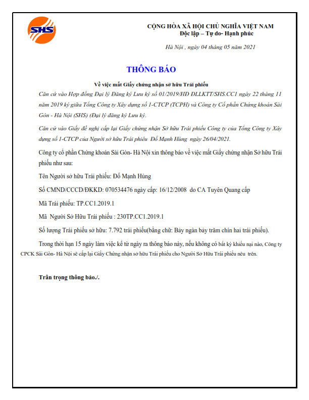 Thông báo Về việc thất lạc Giấy chứng nhận quyền sở hữu Trái phiếu của Đỗ Mạnh Hùng