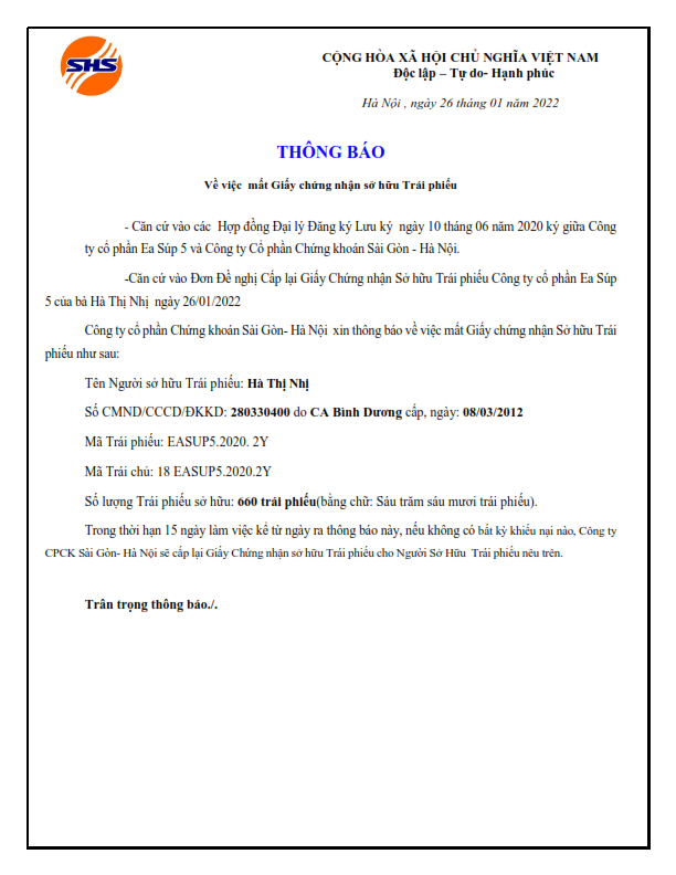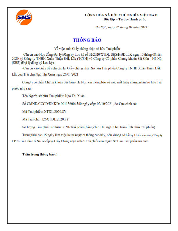 Thông báo về việc thất lạc Giấy chứng nhận quyền sở hữu Trái phiếu của Đỗ Thị Thanh Tâm, Hà Thị Nhị và Trần Thị Xuân