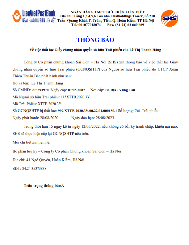 Thông báo Về việc thất lạc Giấy chứng nhận quyền sở hữu Trái phiếu của Lê Thị Thanh Hằng
