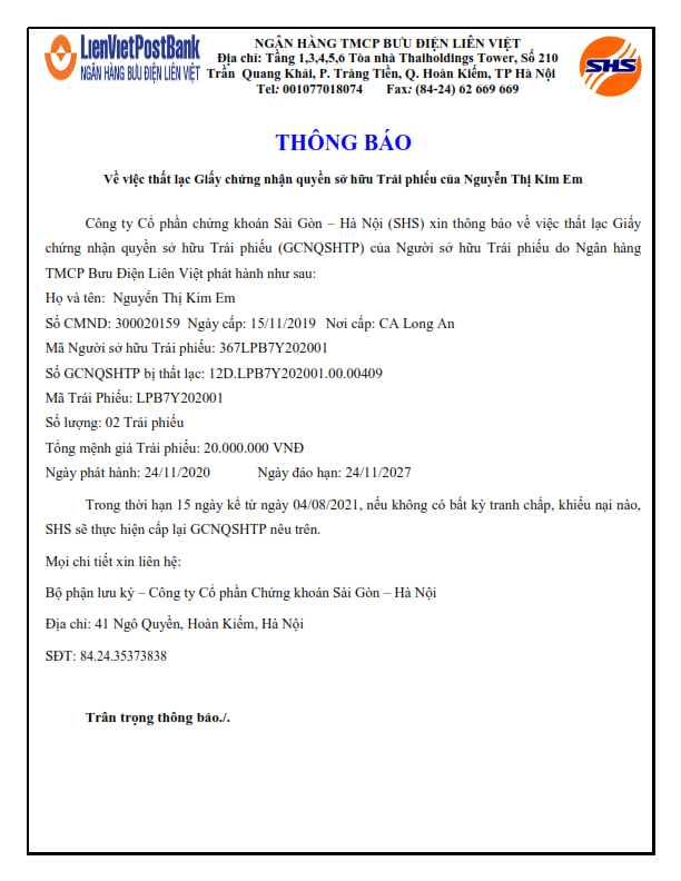 Thông báo Về việc thất lạc Giấy chứng nhận quyền sở hữu Trái phiếu của Nguyễn Thị Kim Em
