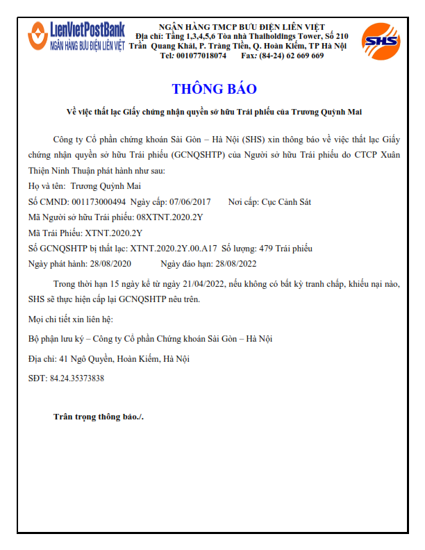 Thông báo Về việc thất lạc Giấy chứng nhận quyền sở hữu Trái phiếu của Trương Quỳnh Mai