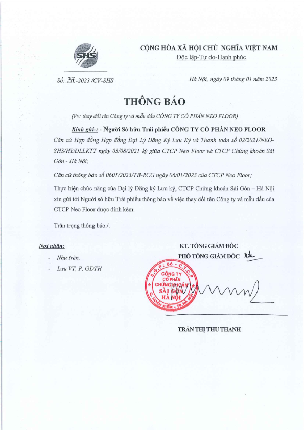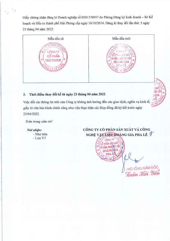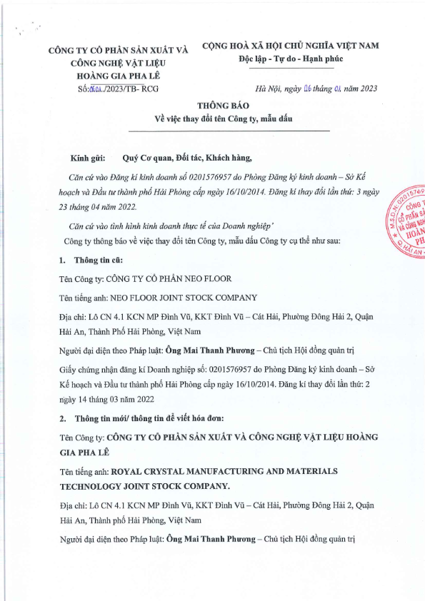 Thông báo: Về việc thay đổi tên Công ty và mẫu dấu Công Ty Cổ Phần NEO FLOOR (tên Doanh nghiệp mới: CTCP Sản xuất và Công nghệ vật liệu Hoàng Gia Pha Lê)