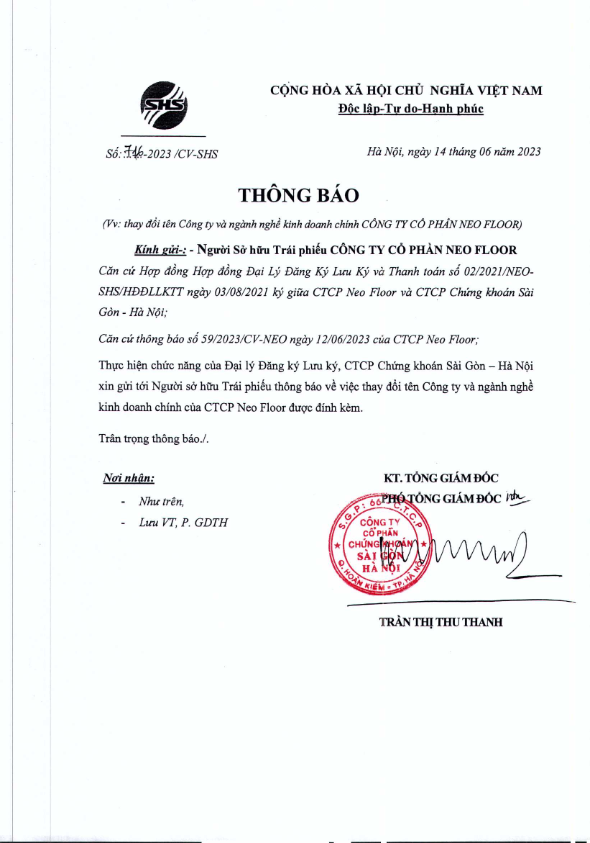 Thông báo: Về việc thay đổi tên Công ty và ngành nghề kinh doanh chính CTCP NEO Floor
