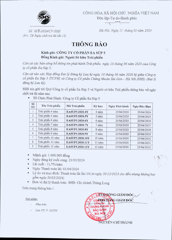 - Thông báo về việc gia hạn thời gian thanh toán tiền mua lại trước hạn trái phiếu Công ty cổ phần EA súp 5 - 15/03/2024
