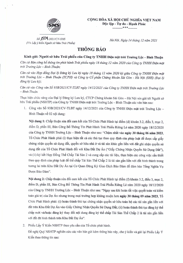 Thông báo v/v chốt danh sách Người sở hữu Trái phiếu để thực hiện Lấy ý kiến bằng Văn bản cho Công ty TNHH Điện mặt trời Trường Lộc – Bình Thuận