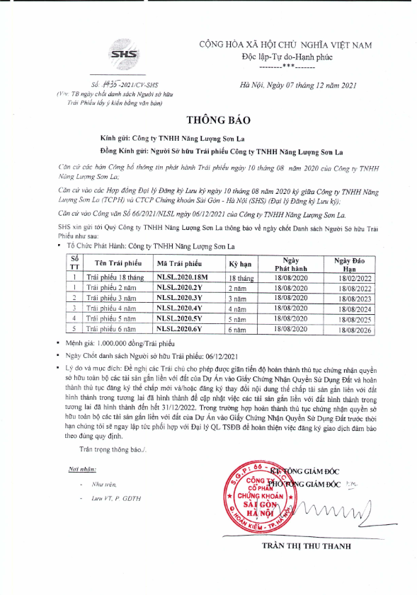 Thông báo v/v chốt danh sách Người sở hữu Trái phiếu để thực hiện Lấy ý kiến bằng Văn bản cho Công ty TNHH Năng Lượng Sơn La
