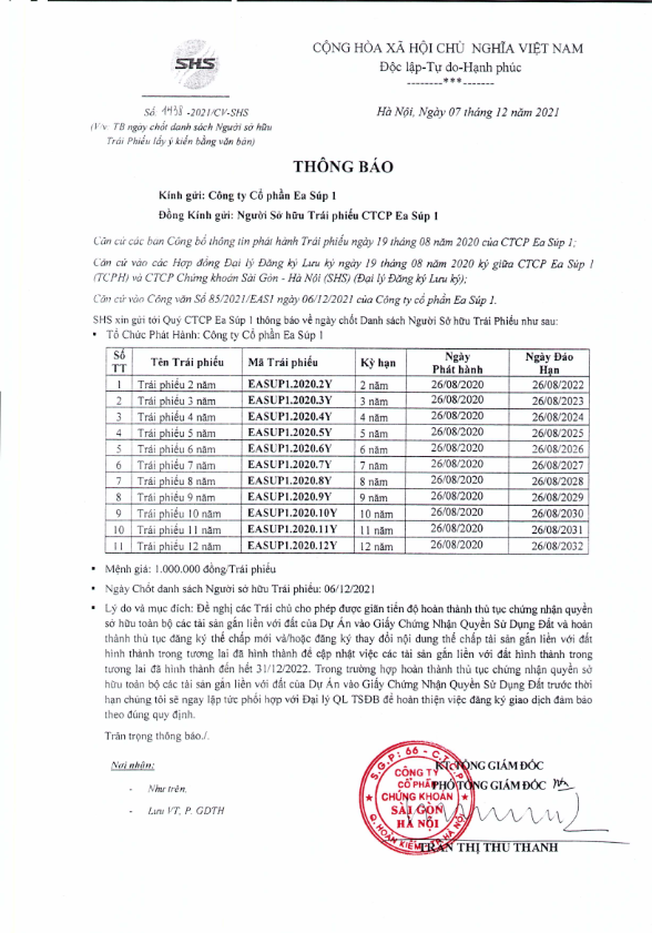 - Thông báo v/v chốt danh sách Người sở hữu Trái phiếu để thực hiện Lấy ý kiến bằng Văn bản cho CTCP Ea Súp 2. - 06/12/2021