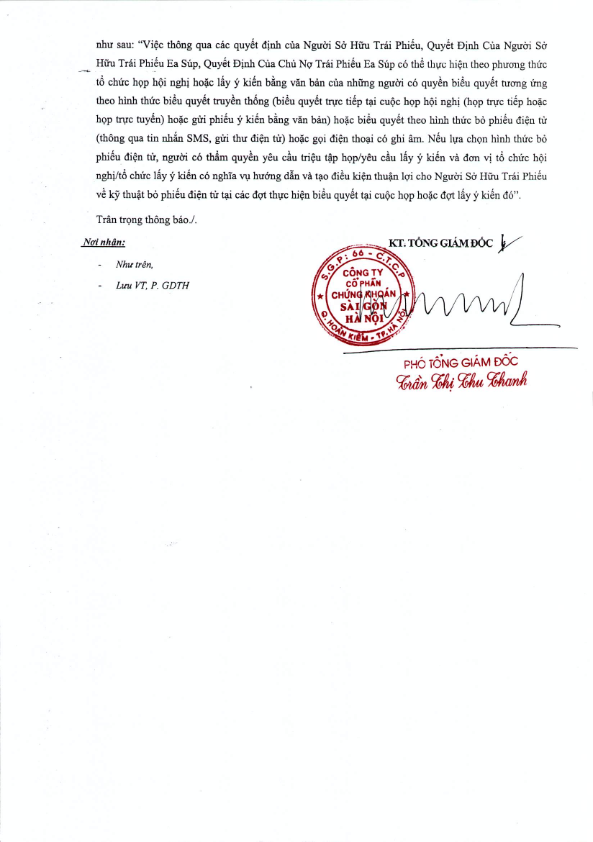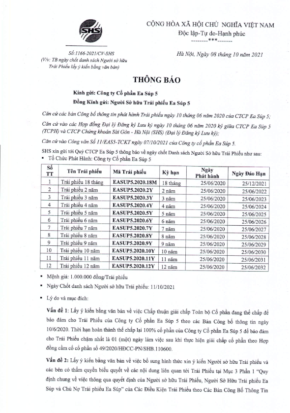 Thông báo v/v chốt danh sách Người sở hữu Trái phiếu để thực hiện Lấy ý kiến bằng Văn bản cho CTCP Ea Súp 5